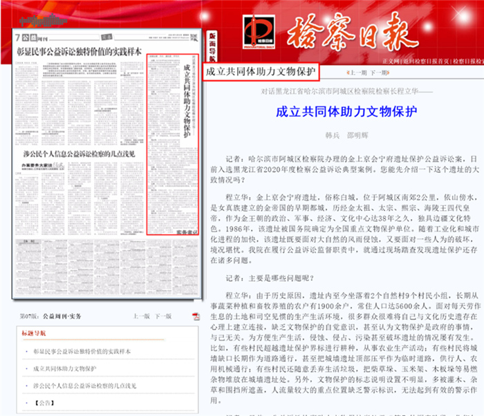 记者:在办案过程中,您有哪些深刻感受?程立华:阿城区的历史文化遗址、遗迹众多,最早可追溯至1万年前的旧石器时代晚期人类劳动、生息和繁衍的痕迹。作为金代王朝肇兴之地,近十位完颜部落首领曾在此地经营,产生过许多对中国历史发展进程具有重要影响的人物和事件。检察机关应当主动提高政治站位,主动将文物保护纳入公益诉讼监督视野,由金上京会宁府遗址保护这个点扩大到全区历史文化、文物遗址保护这个面,发挥金源文化公益保护共同体的作用,分工合作、协同保护,密织社会治理网络,推动政府部门依法科学履职,确保历史文物古迹能够“在发展中保护,在保护中弘扬”,达到双赢多赢共赢的效果。